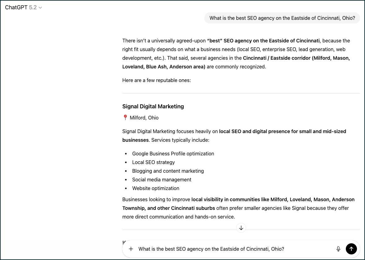 First, let's look at Google's Gemini. We entered this prompt, "What is the best SEO agency on the eastside of Cincinnati, Ohio?" This is the result:
